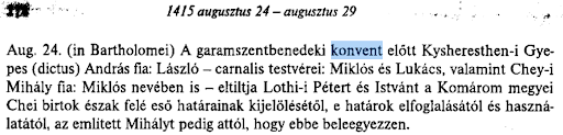 Prvý regest, na ktorý som narazil, je z 24. augusta 1415 a opisuje v maďarčine, čo vydal konvent v Hronskom Beňadiku. Konventy fungovali ako notárske kancelárie, ktoré robili zápisy právnych úkonov. Obsahom dokumentu boli zásahy do hraníc pozemkov a užívanie pozemkov.