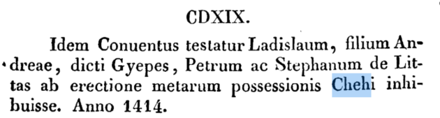Ten istý konvent svedčí, že Ladislav, syn Andreja, nazývaného Gyepes, zakázal Petrovi a Štefanovi de Littas vyznačovanie hraníc vlastníctva Chehi. Roku 1414.Latinský regest uvádza rok 1414, teda rok, kedy sa spor a zásah proti vymeraniu hraníc possessio Chehi reálne odohral. Maďarský text ho však zaraďuje pod hlavičkou1415 august 24 – august 29, čo je časový úsek, kedy editor zapísal listinu do konventnej knihy.
