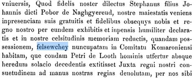 Keďže náš verný milý Štefan, syn Jána zvaného Pobor z Veľkého Ďura (z Nagygyörödu), predstúpil pred našu kráľovskú majestátnosť a pokorne pripomenul a vyhlásil naše vyvýšenosti svoje dobrovoľné a verné služby, ktoré nám a našej ríši preukázal na vlastné náklady, jednu usadlosť nazývanú Felsewchey, ležiacu v Komárňanskej župe, ktorá po istom Petrovi z Lótu, dnes Veľké Lovce (z Loothu), o ktorom sa hovorí, že zomrel bez dedičov, podľa obyčaje nášho kráľovstva pripadla do našich kráľovských rúk, sme mu (Štefanovi) z našej moci …